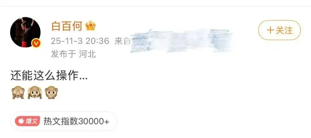 值得一提的是,就在11月3日晚,白百何在微博发文“还能这么操作……”,此后相关话题冲上热搜。